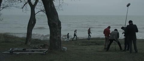 Silence. The smooth water reflects the green shore and the cold evening sky.